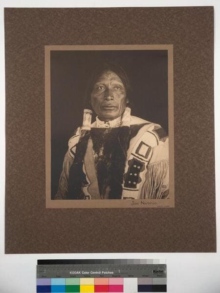 Studio portrait of a Pueblo Indian man wearing a hat, beaded neck piece, and buckskin top.