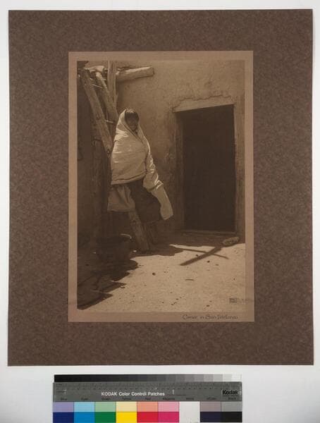 Portrait of a Pueblo Indian man wearing a blanket over his head and shoulders.