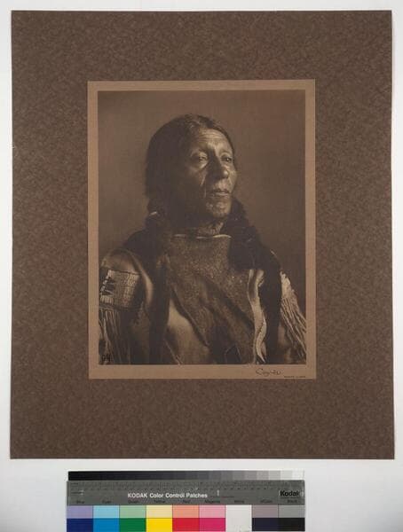 Portrait of a Pueblo Indian man with fur pieces in his hair and wearing a buckskin top.