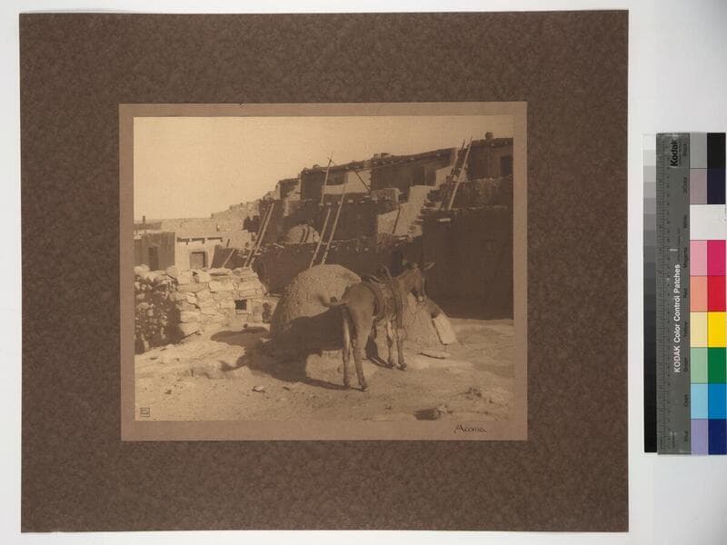 View of a pueblo with hornos in front of dwellings, and horses in the foreground.