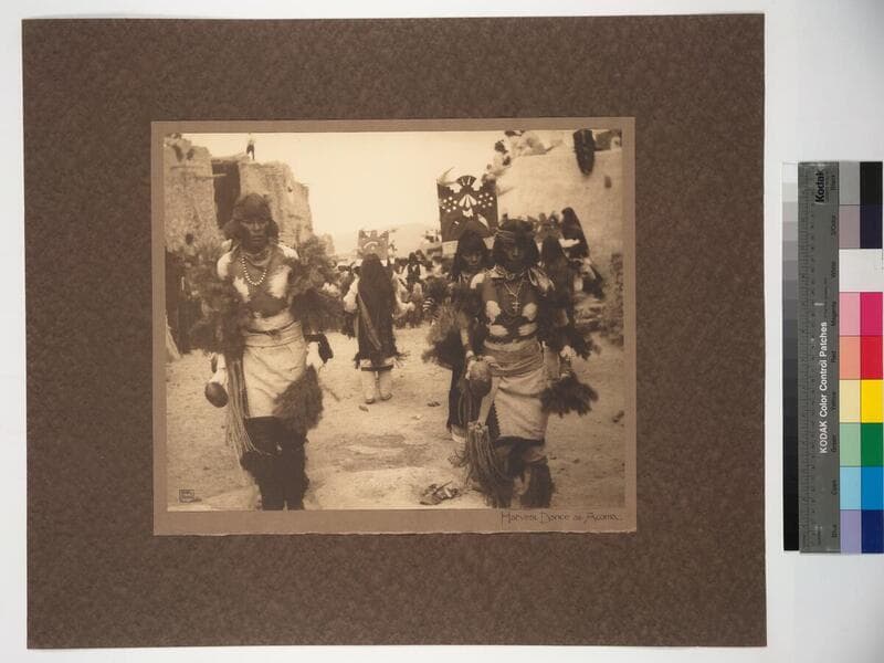 Pueblo Indians in ceremonial dress performing a corn dance.