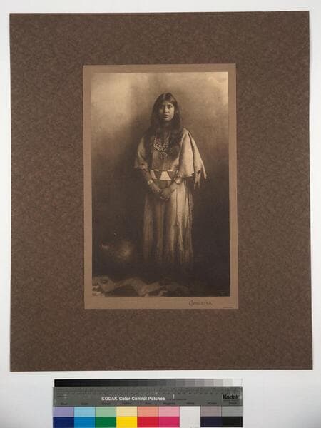 Portrait of a girl in a buckskin dress with silver jewelry and a beaded belt.