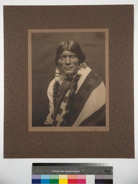 Portrait of a man with a blanket around his shoulders and a feather in his hair.