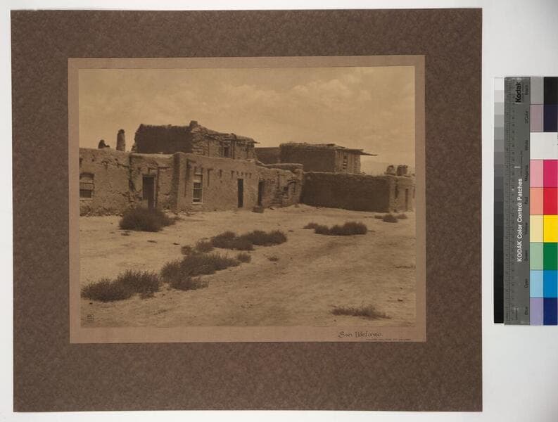 View of a pueblo with hornos in front of dwellings, and horses in the foreground.