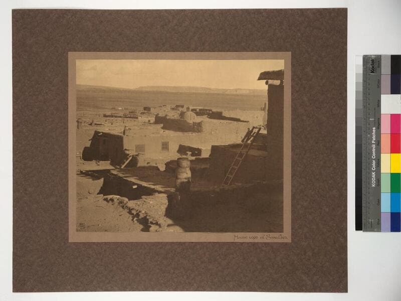 View of pueblo dwellings with hornos.