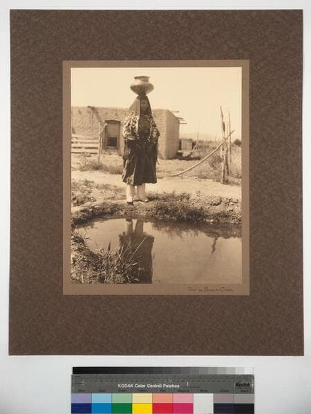A Hopi woman with large pottery vessel, standing next to a pool of water.