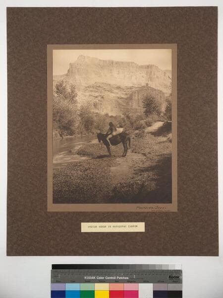 A woman on horseback, with a baby in a cradle-board and another child with her.