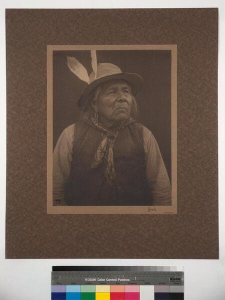 Portrait of a Pueblo Indian man wearing a buckskin top and feathers in his hair.