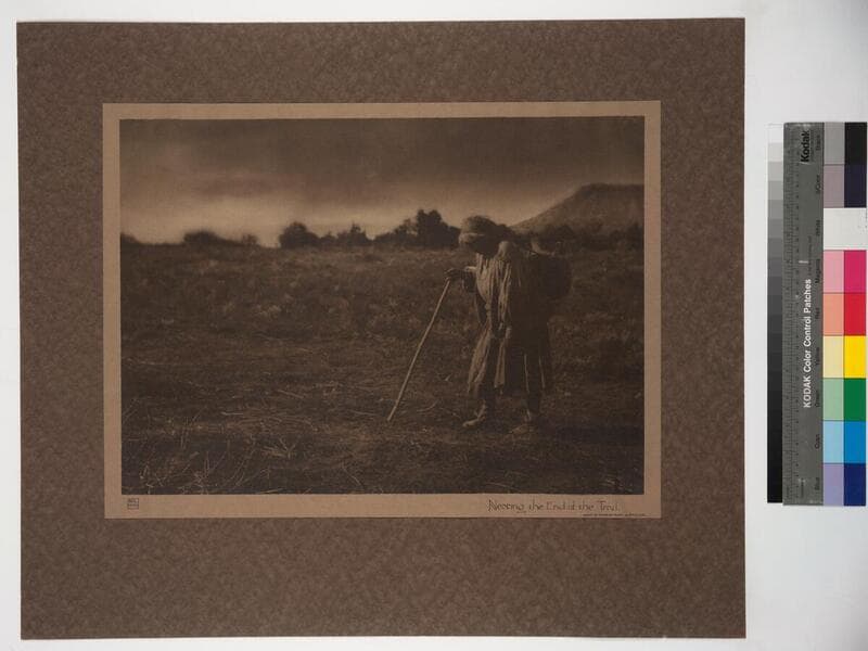 Portrait of an older Apache man wrapped in a blanket and wearing a long necklace.
