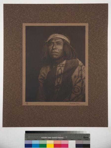 Portrait of an older Apache man wrapped in a blanket and wearing a long necklace.