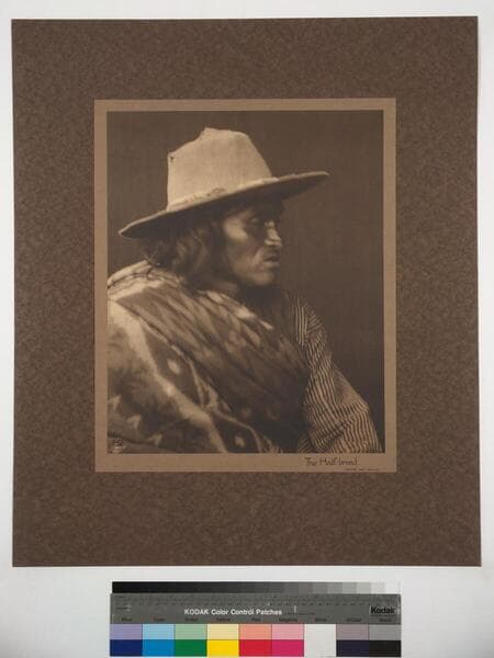 Portrait of a man wearing a buckskin top, blanket over his shoulder, and a feather in his hair.