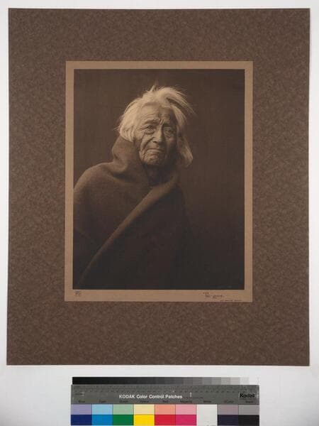 Portrait of an older Apache man wrapped in a blanket and wearing a long necklace.