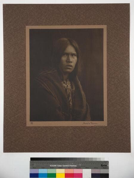 Portrait of a young Apache man with long hair and a blanket over his shoulder.