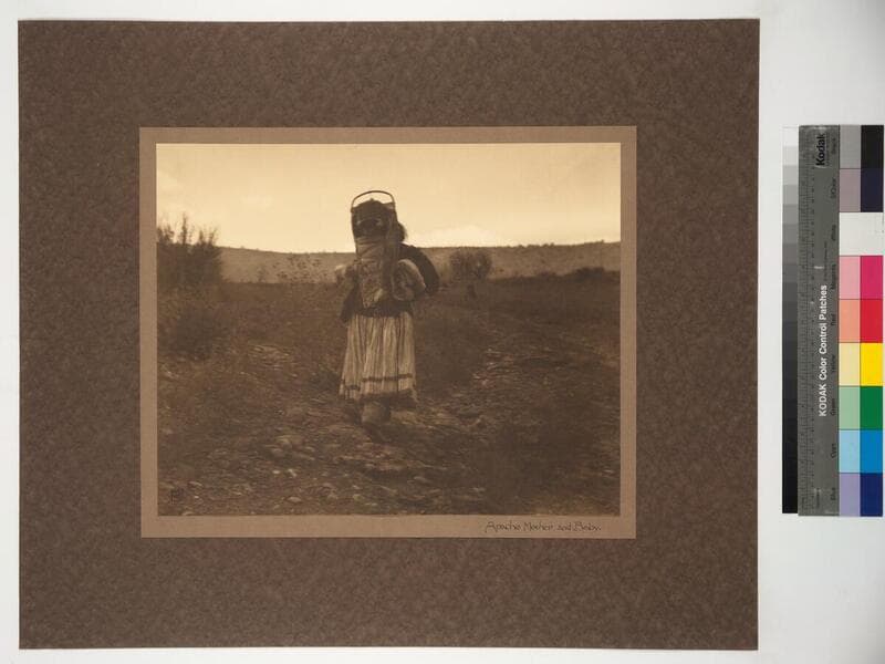 Studio portrait of a Navajo woman and a baby in a cradle-board. The woman has a blanket around her.