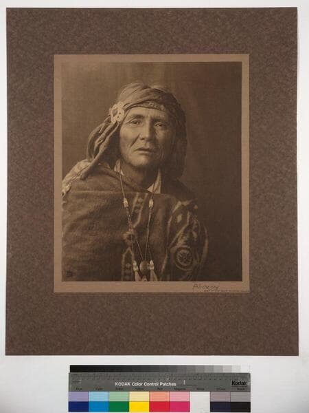 Portrait of a young Apache man with long hair and a blanket over his shoulder.