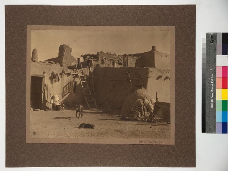 Dancers in the pueblo plaza with spectators watching from above. Dogs run loose in the foreground.