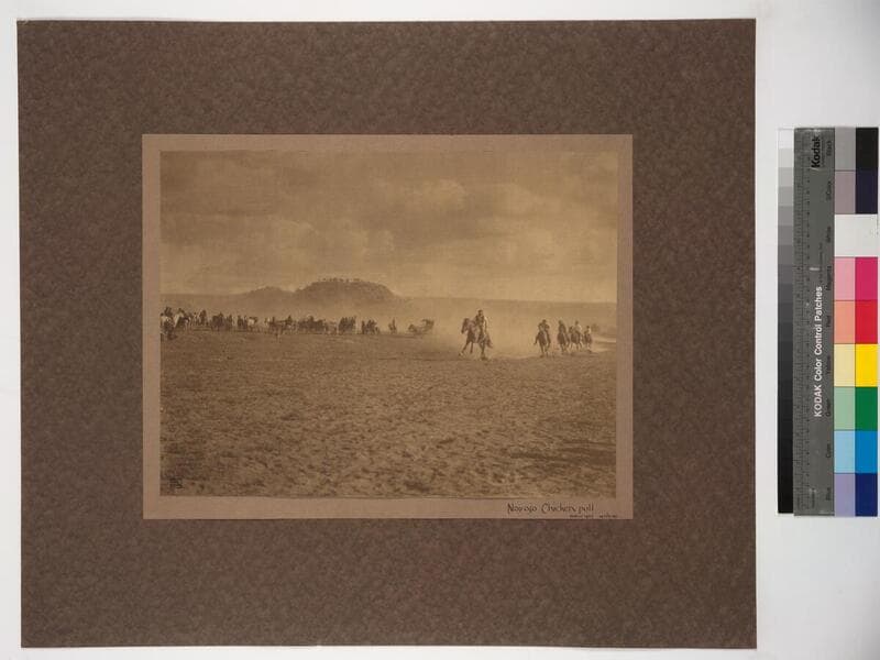 Men racing through the desert on horseback with spectators on horseback in the background.