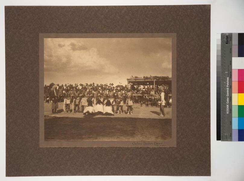Pueblo Indians in ceremonial dress performing a basket dance with spectators in the background.