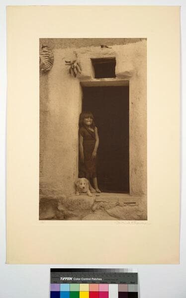 A young Hopi girl standing in a pueblo doorway, with a small white dog at her feet.