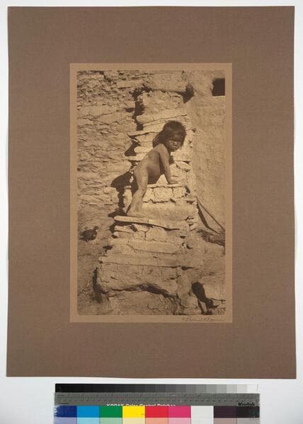 Small Hopi boy climbing on the stone steps of a pueblo building.