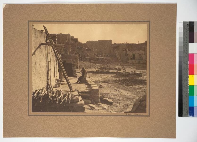 Group of Hopi Indians sitting on adobe walls.