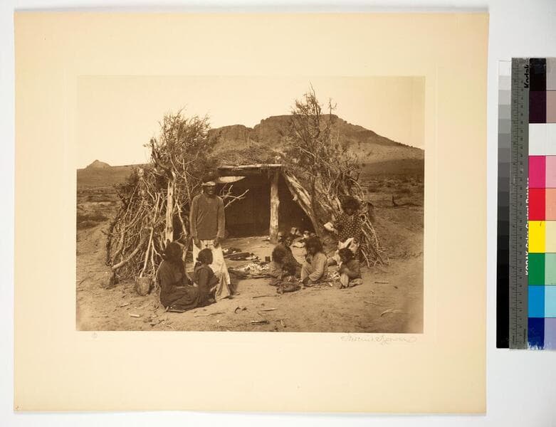 View of a Navajo dwelling in the Chinle desert, a woman and child sitting and standing outside of it.