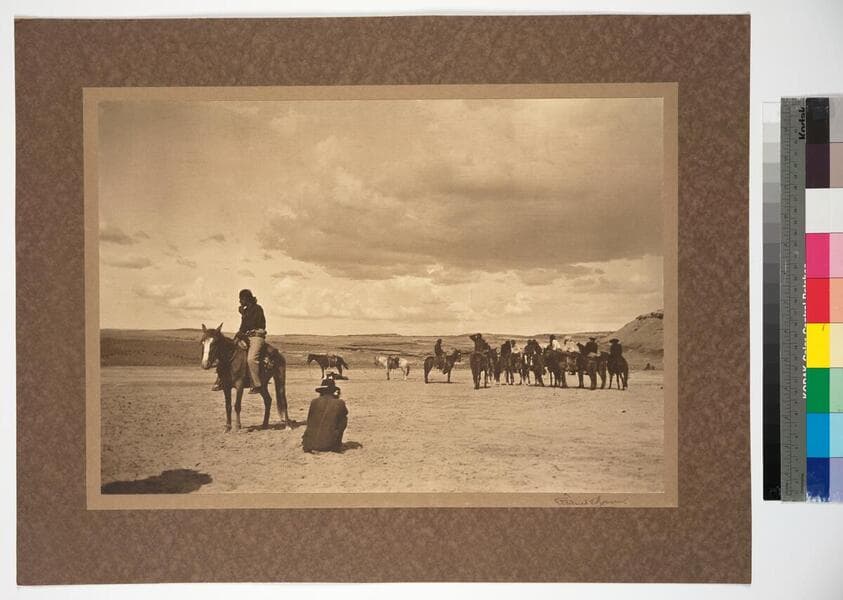 Two groups of Navajo on horseback gathered in the desert, watching horseback riders racing each other.