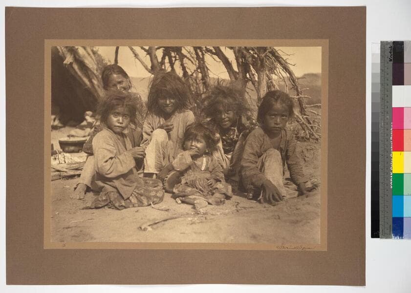 Navajo chief, Hostine Nez's, children seated in front of a dwelling.