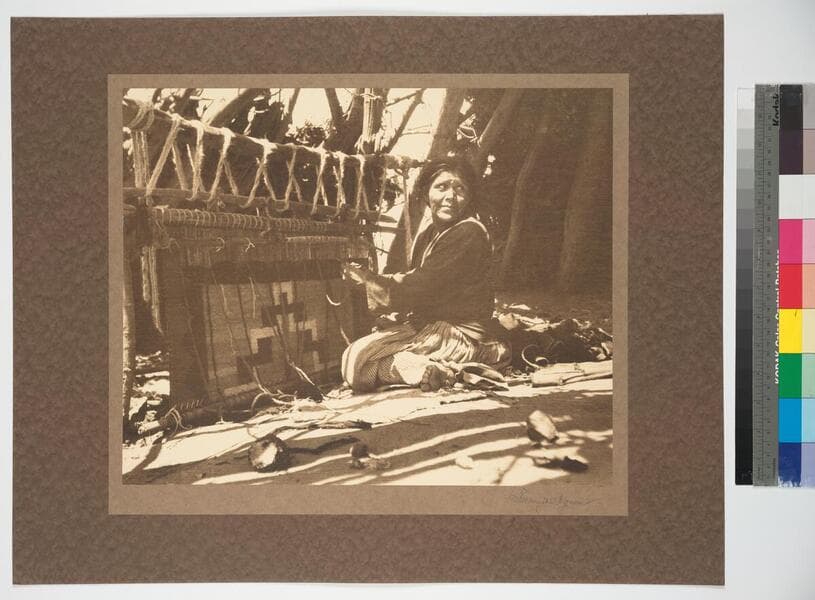 Navajo woman seated in front of a loom and weaving a blanket.
