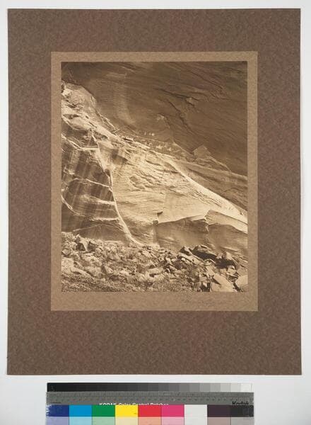 A canyon prehistoric building partly destroyed by falling rock from cliff wall. Del Muerto, Northeast Arizona