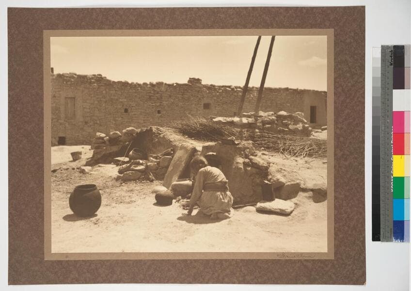 Hopi woman tending an oven, with several large pots nearby.