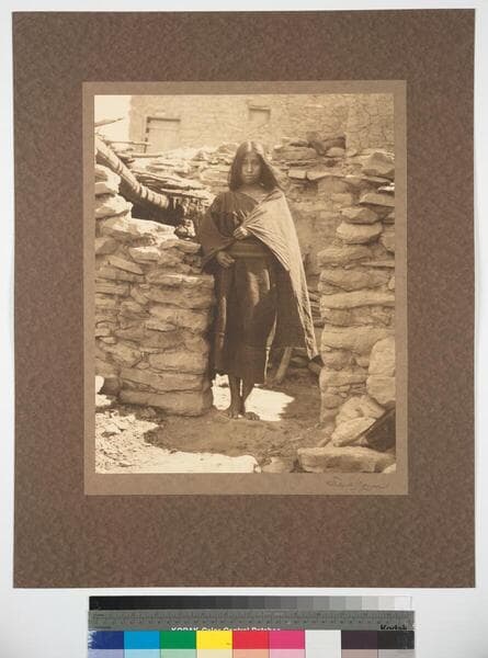 Young Hopi girl standing beside pueblo walls with a blanket around her shoulders.