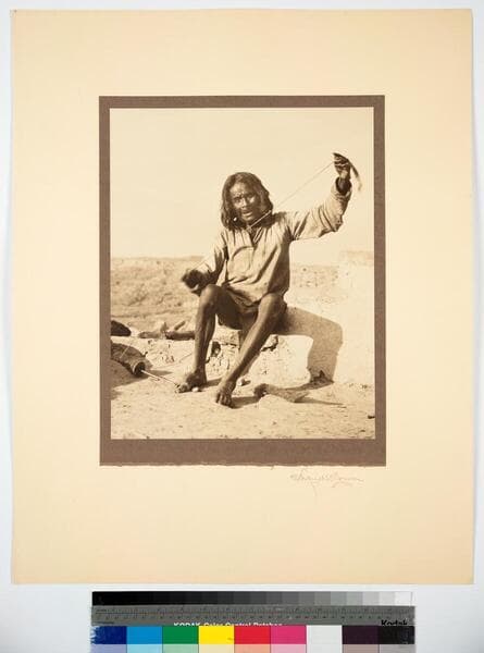 Hopi Indian of Oraibi, Arizona. Making yarn for Hopi ceremonial dress