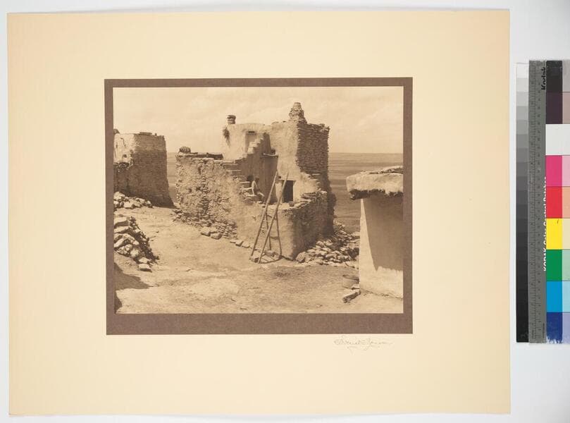 View of a small two-level pueblo house with ladder. A Hopi man is seen on the stairs.