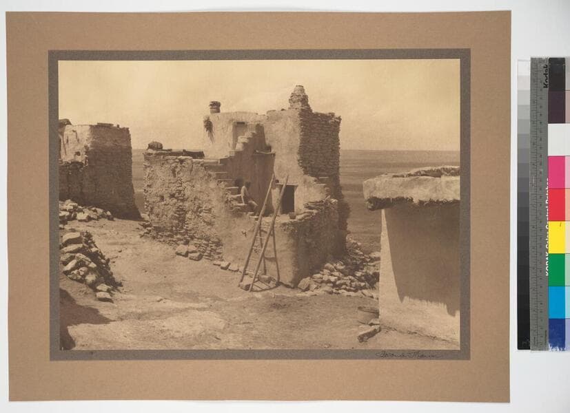 View of a small two-level pueblo house with ladder. A Hopi man is seen on the stairs.