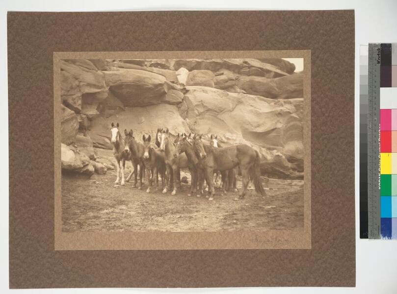 A low adobe building with horse corral. Covered wagons and horses are nearby.