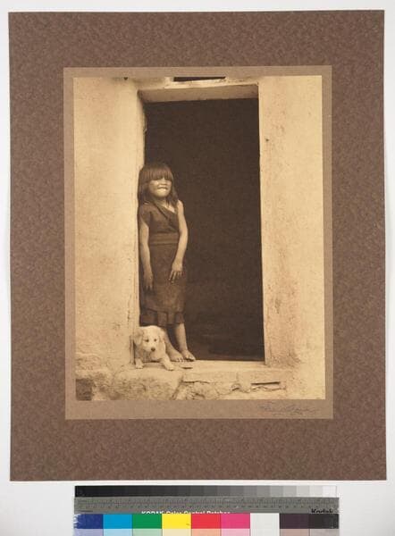 Hopi girl standing in a door way of an adobe building, with dried corn hanging above and a small dog at her feet.