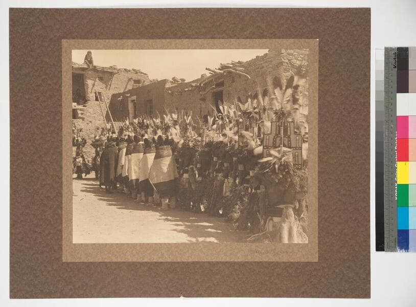 Hopi men , women, and children wearing regalia and taking part in a ceremony.