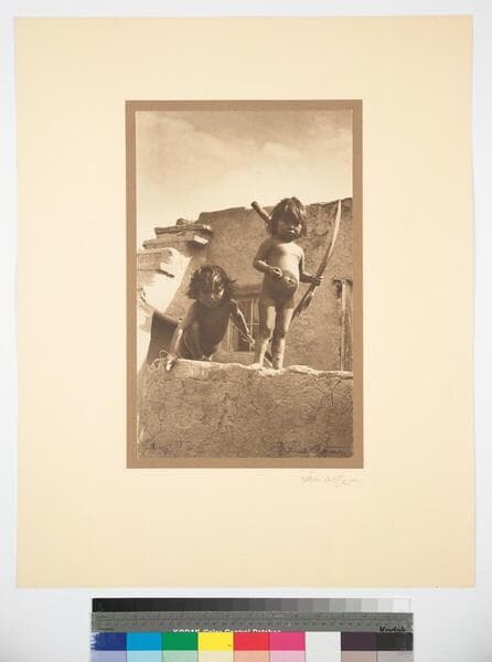 Two little Hopi boys seated on a wall, one holding a bow and arrows.
