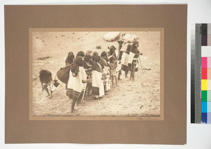 Hopi men, women and a child dressed in ceremonial regalia, and carrying various items taking part in a ceremonial dance.