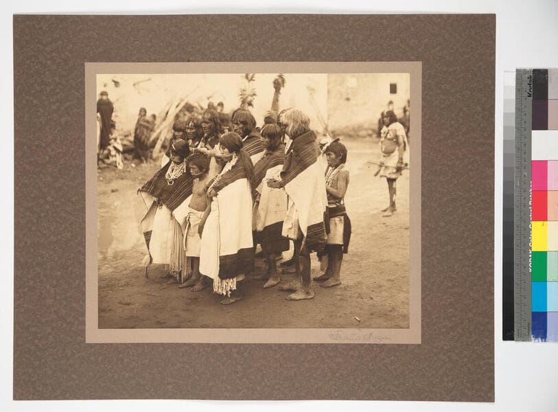 Hopi men and women in ceremonial regalia preparing to take part in a dance.