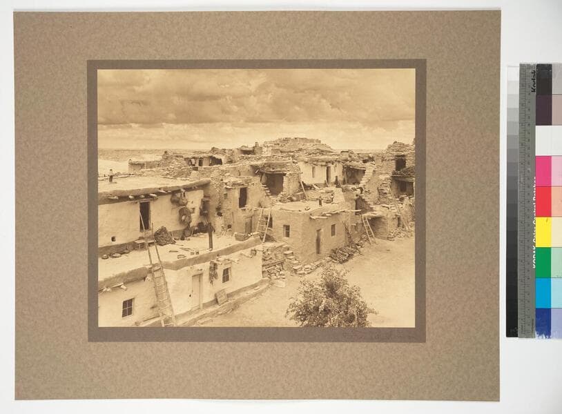 View of two Hopi pueblos. Inhabitants of pueblo village in foreground can be seen taking part in daily life.
