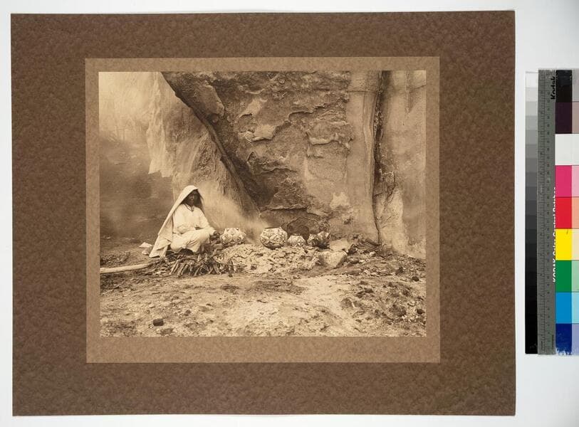 Nampeyo, the artist-potter of the Hopi people, arranging pottery for firing, Hano, First Mesa, Arizona