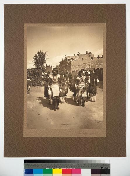 Indian men and women in plaza of pueblo, wearing dance regalia, body paint and holding objects. Spectators are seen on the walls of the pueblo buildings.
