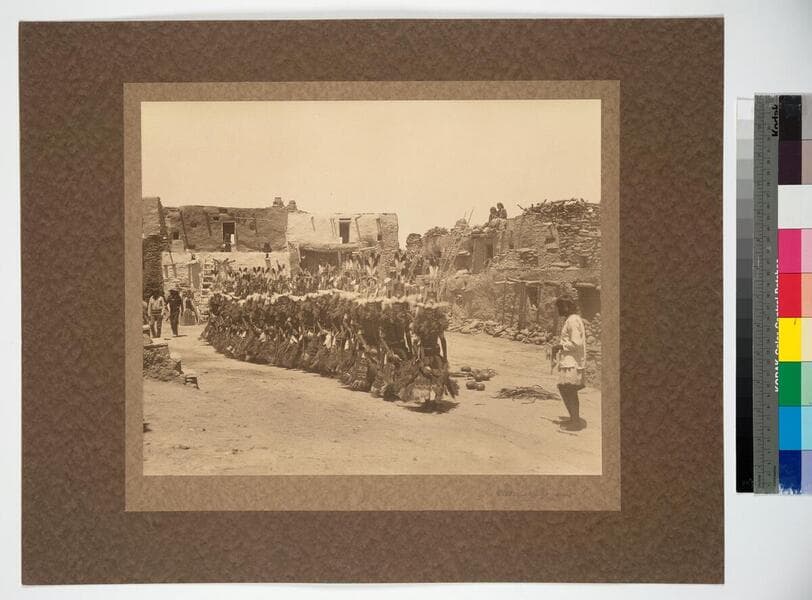 Indian men and women in plaza of pueblo, wearing dance regalia, body paint and holding objects. Spectators are seen on the walls of the pueblo buildings.