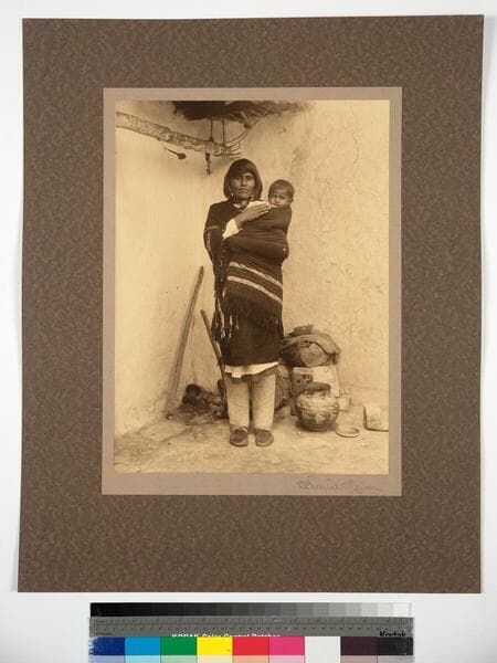 Zuni woman with baby in her lap, leaning against a wood ladder