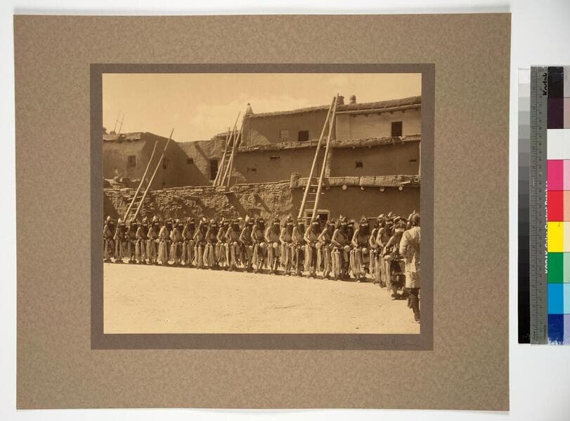 Indian men and women in plaza of pueblo, wearing dance regalia, body paint and holding objects. Spectators are seen on the walls of the pueblo buildings.