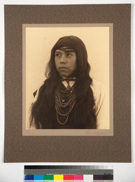 Portrait of Hopi woman with yarn coiled around braids of hair.