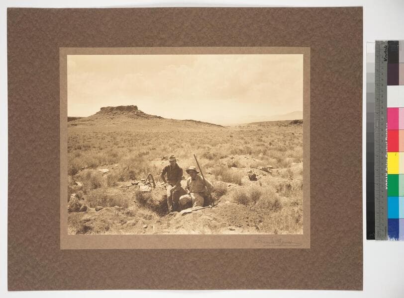 Excavating in a prehistoric Indian burial ground. Citadel ruin on hill in background. Painted Desert, Arizona
