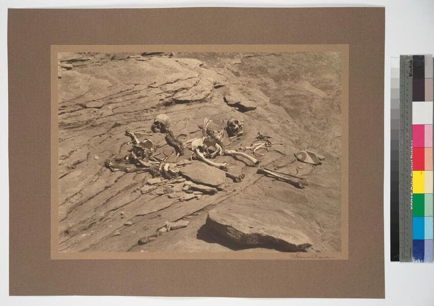 The evidence of a tragedy discovered in a remote canyon of the Chinle desert, Arizona. The bones are of Navajo Indians